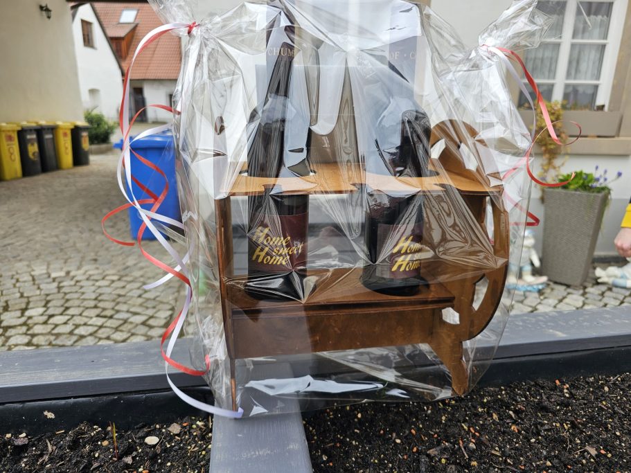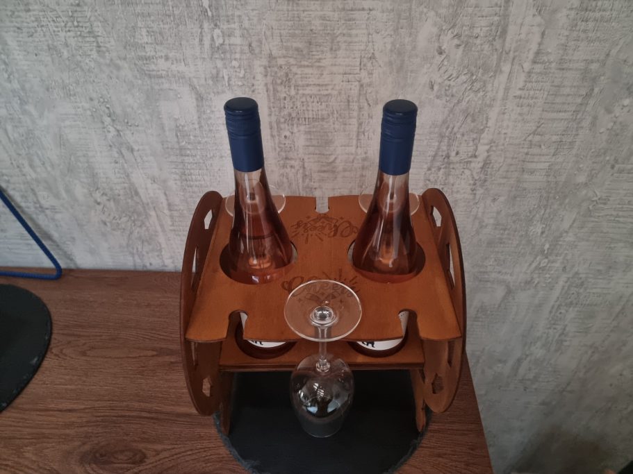 Weinständer aus Holz, individuell personalisiert, farbig gebeizt in Kirschholz, für 2 Flaschen und 6 Weingläser